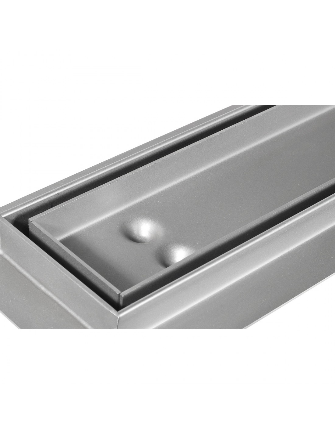 Budget-Duschrinne aus Edelstahl 90 cm für Fliesenboden mit Isolierflansch, Dichtmanschette, niedrigem Siphon, höhenverstellbare Standfüße und Designrost Stone