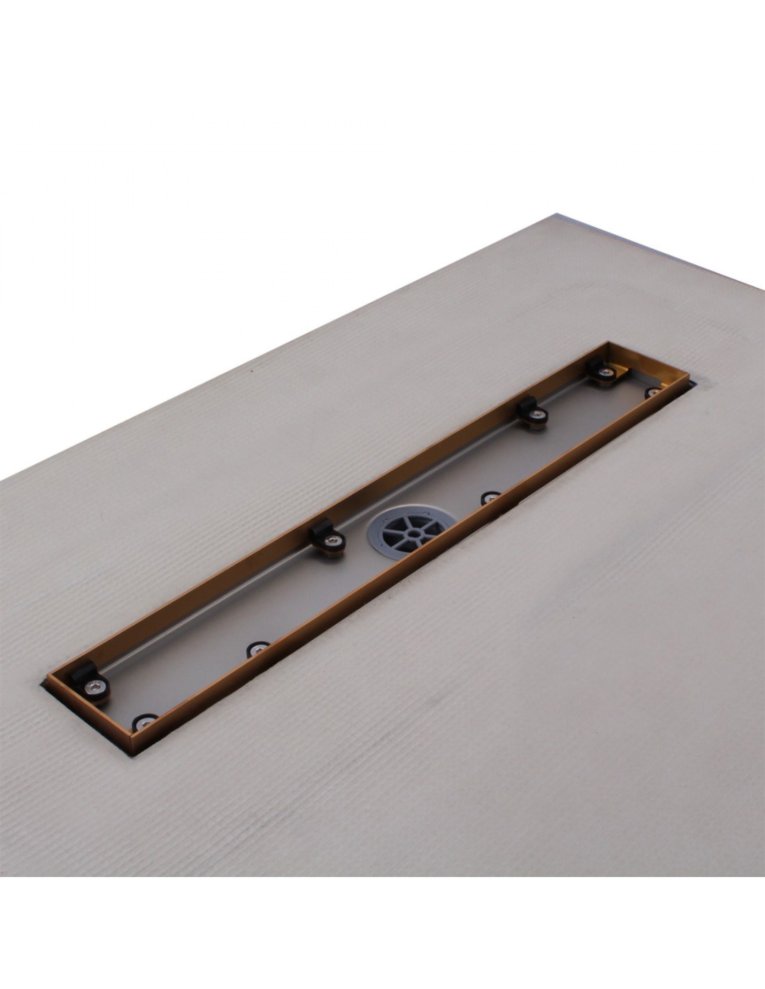 - Integrierter Ablauf: Werkseitig wird eine [drain_length] cm lange Duschrinne aus der Serie "Premium" mit Isolierflansch sauber in die Platte eingearbeitet.