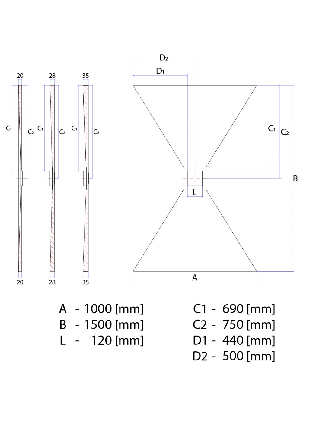 - Eine Plattenstärke von 35 mm ist die dickste verfügbare Stärke mit einem steileren Gefälle, höherer Schalldämmung und robusteren Oberfläche. Es eignet sich für größere Duschbereiche mit einer Längenseite ≥ 120 cm.