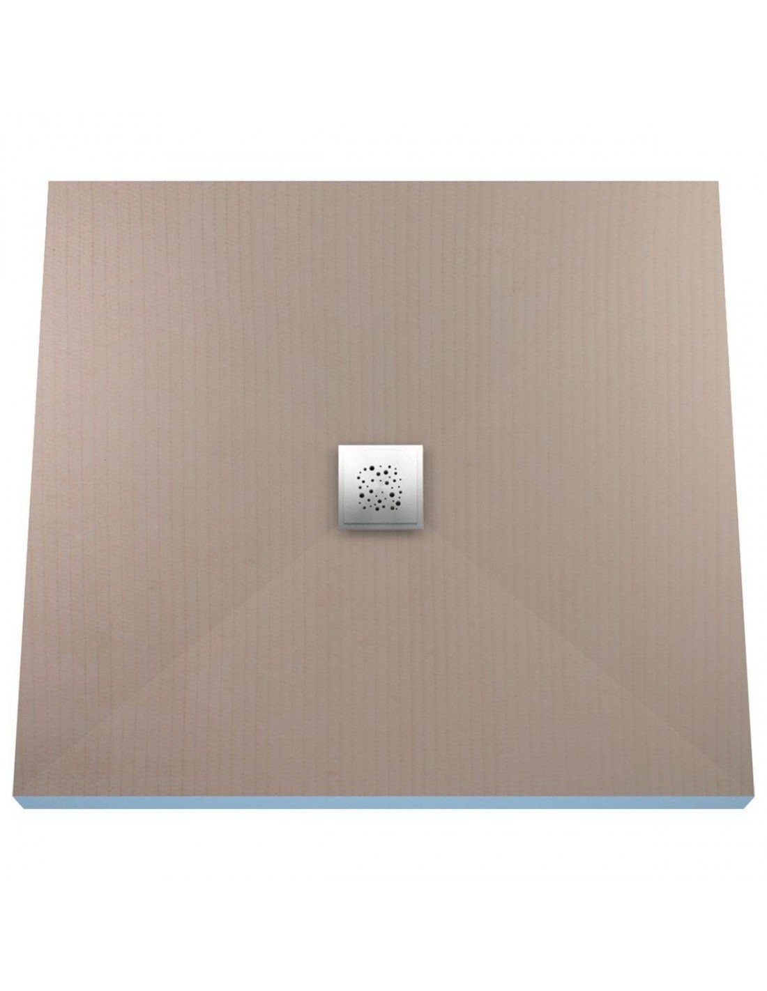Befliesbares Duschelement 120 x 120 cm mit vierseitigem Gefälle für Fliesenboden mit integriertem Edelstahl-Punktablauf (wahlweise mittig, am Rand versetzt oder in der Ecke), inkl. Siphon und Designrost Mistral (Tropfen)