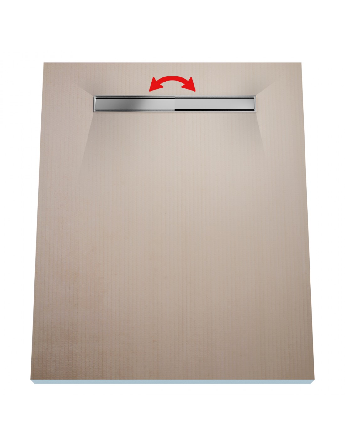 Das Wiper Duschelement beinhaltet ab Werk eine integrierte Edelstahl-Duschrinne aus der Serie "Premium". Diese ist grundsätzlich 300 mm kürzer als die Seite, auf der die Rinne verbaut wird - Beispiel: Bei einem 800 x 1200 mm großen Board, ist die Länge der Rinne = 500 mm. Der umschließende Flansch der Duschrinne ist in der Duschplatte versunken und gewährleistet somit eine sichere Wasserabweisung.