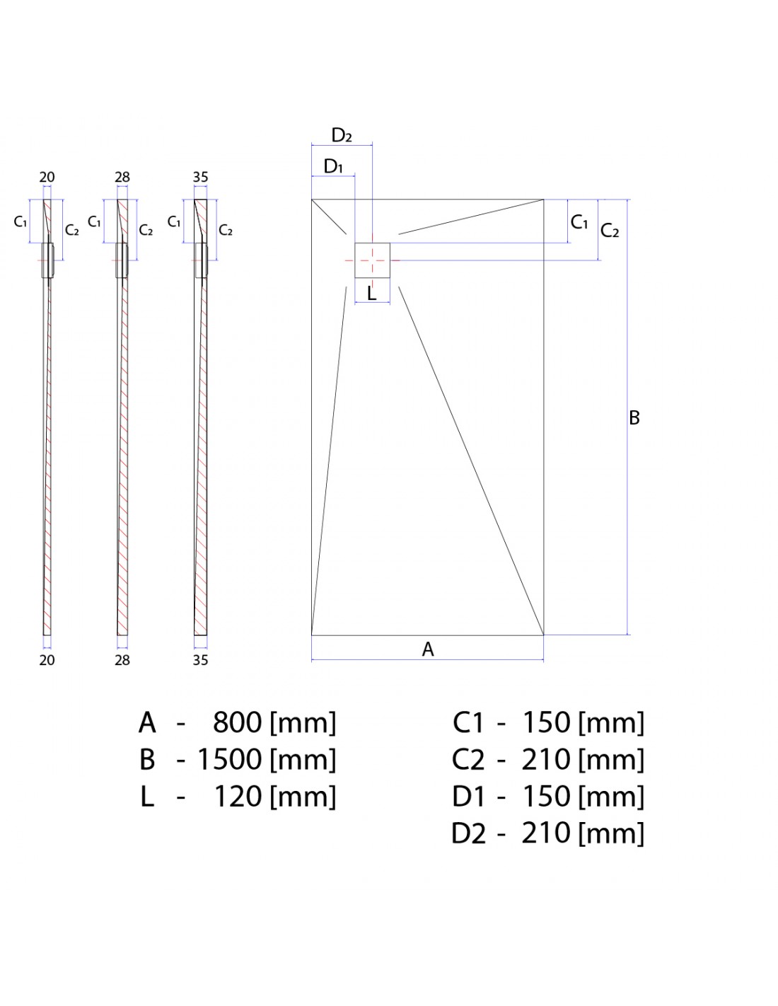 - Gesamthöhe (H): Stärke des Boards (20, 28, 35 mm) + Höhe des Siphons (Drop 50 - 78 mm / Drop 35 - 63 mm / Senkrecht - 132 mm) [mm]