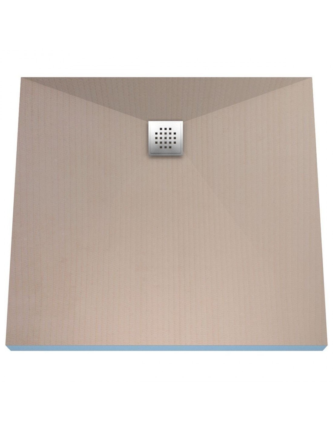 Befliesbares Duschelement 80 x 80 cm mit vierseitigem Gefälle für Fliesenboden mit integriertem Edelstahl-Punktablauf (wahlweise mittig, am Rand versetzt oder in der Ecke), inkl. Siphon und Designrost Sirocco (Vierecke)