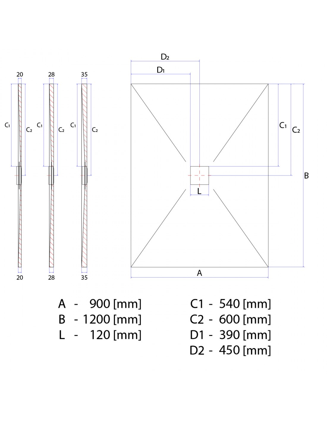 - Eine Plattenstärke von 35 mm ist die dickste verfügbare Stärke mit einem steileren Gefälle, höherer Schalldämmung und robusteren Oberfläche. Es eignet sich für größere Duschbereiche mit einer Längenseite ≥ 120 cm.