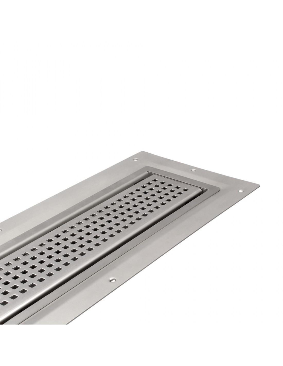 Befliesbares Duschelement 90 x 150 cm mit vierseitigem Gefälle für Fliesenboden mit integrierter Edelstahl-Duschrinne, Siphon und Designrost Sirocco (Vierecke)