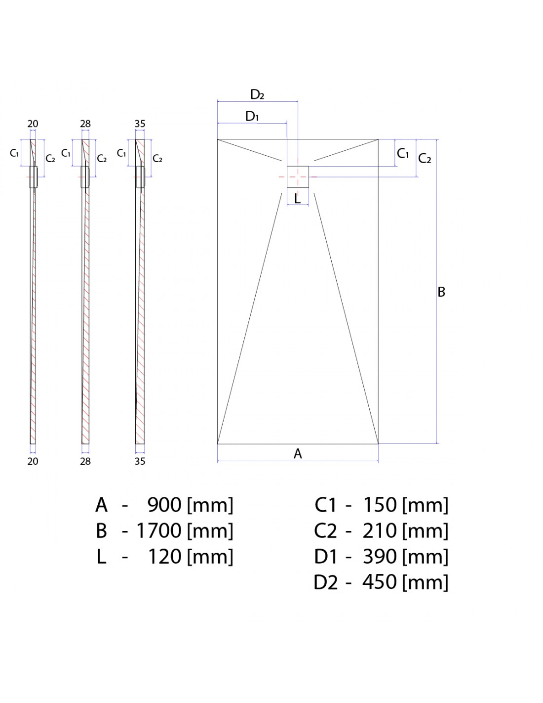 - Eine Plattenstärke von 35 mm ist die dickste verfügbare Stärke mit einem steileren Gefälle, höherer Schalldämmung und robusteren Oberfläche. Es eignet sich für größere Duschbereiche mit einer Längenseite ≥ 120 cm.