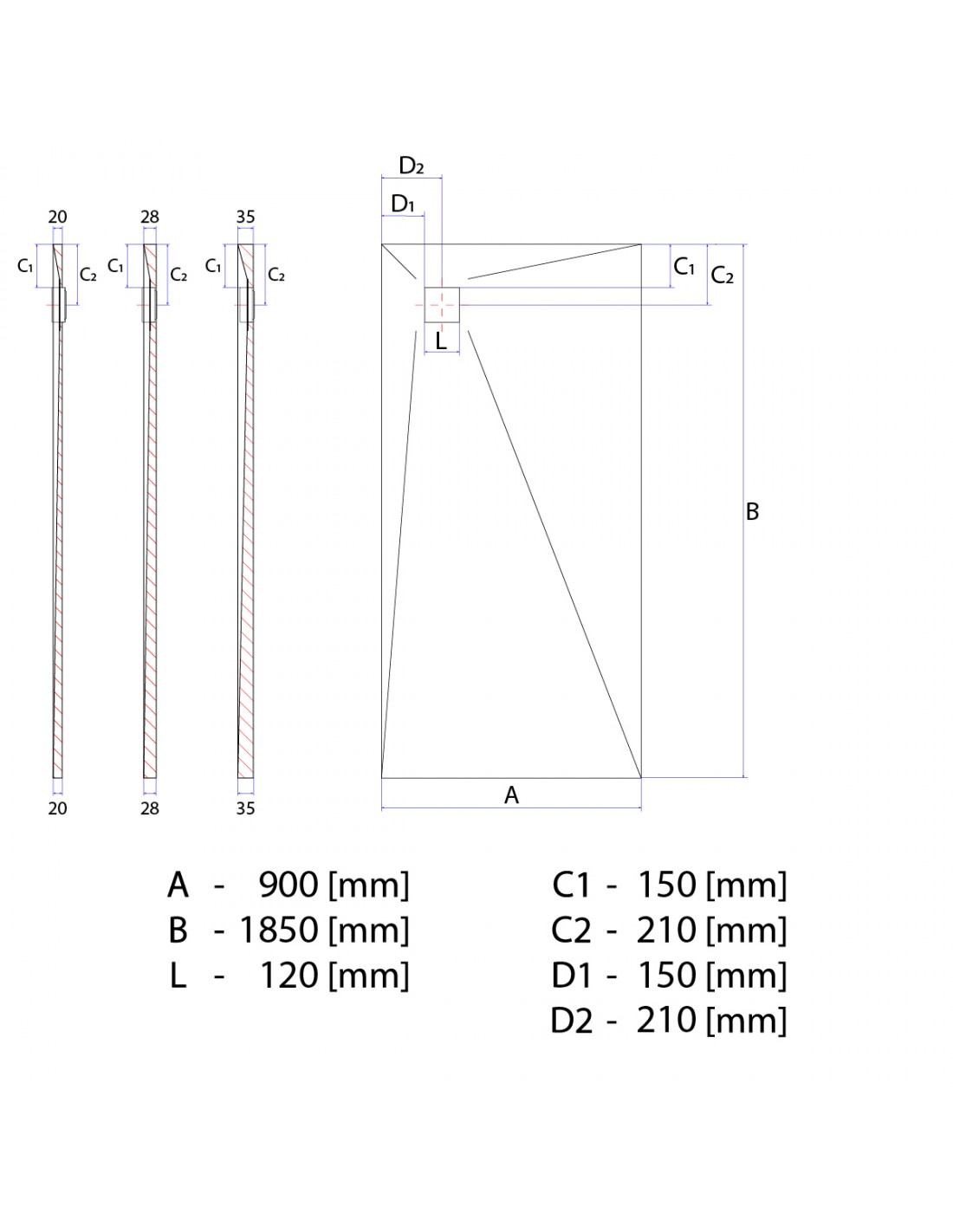 - Eine Plattenstärke von 35 mm ist die dickste verfügbare Stärke mit einem steileren Gefälle, höherer Schalldämmung und robusteren Oberfläche. Es eignet sich für größere Duschbereiche mit einer Längenseite ≥ 120 cm.