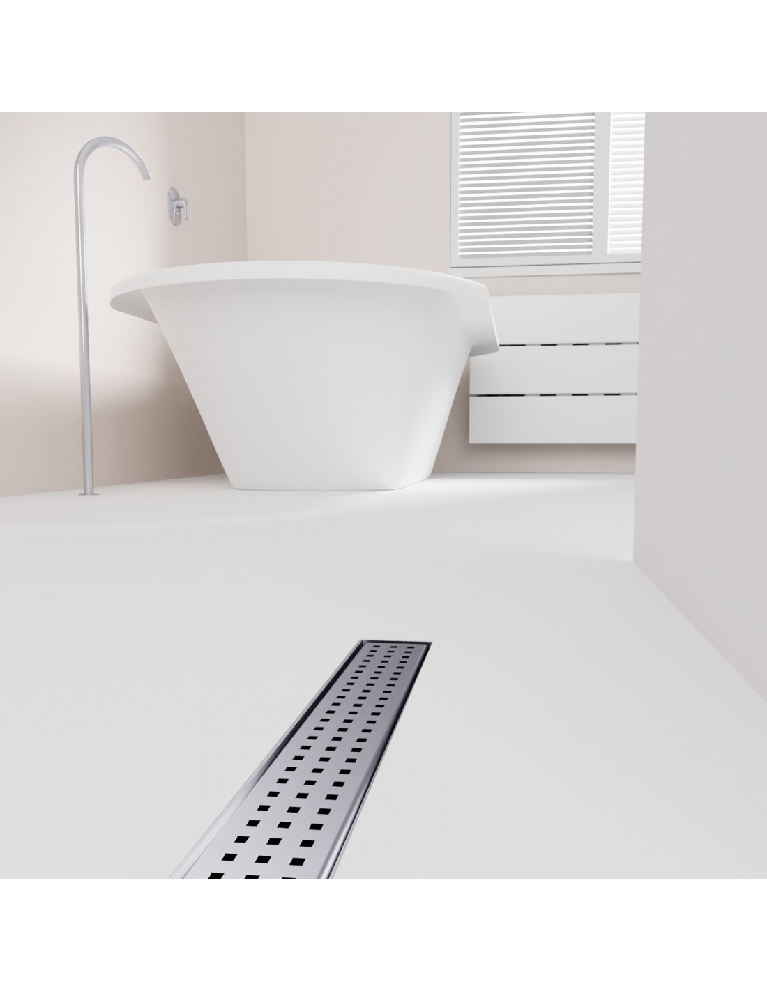 Befliesbares Duschelement 90 x 185 cm mit vierseitigem Gefälle für Fliesenboden mit integrierter Edelstahl-Duschrinne, Siphon und Designrost Ponente (geschlossen)