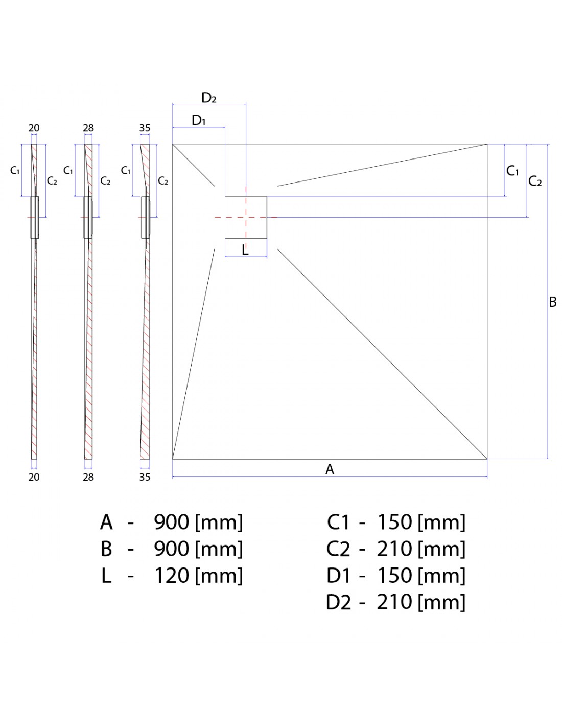 - Gesamthöhe (H): Stärke des Boards (20, 28, 35 mm) + Höhe des Siphons (Drop 50 - 78 mm / Drop 35 - 63 mm / Senkrecht - 132 mm) [mm]
