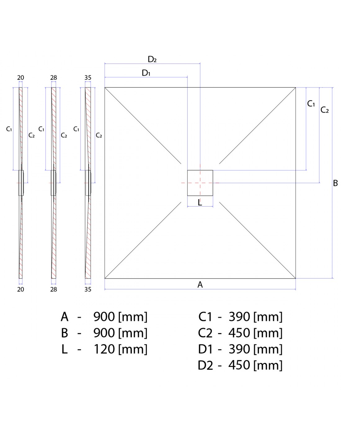 - Eine Plattenstärke von 35 mm ist die dickste verfügbare Stärke mit einem steileren Gefälle, höherer Schalldämmung und robusteren Oberfläche. Es eignet sich für größere Duschbereiche mit einer Längenseite ≥ 120 cm.