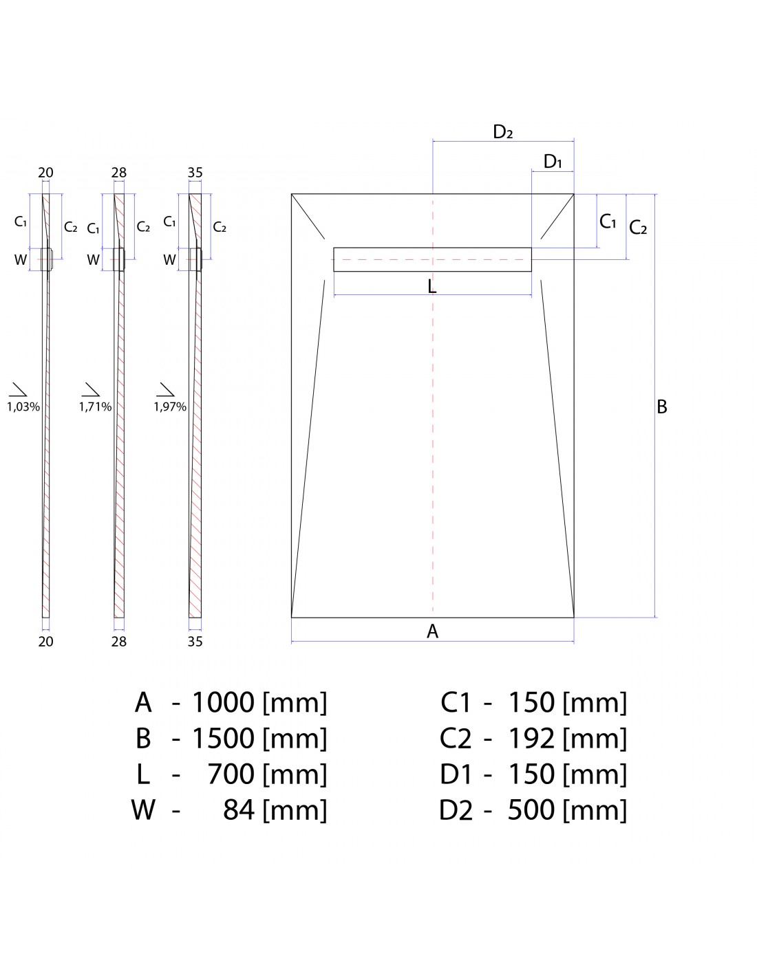 - Eine Plattenstärke von 20 mm eignet sich für Duschen mit einer Breite bis zu 1 Meter, als auch für niedrige Aufbauhöhen. Das eingearbeitete Gefälle versichert einen optimalen Wasserablauf trotz der geringen Dicke.