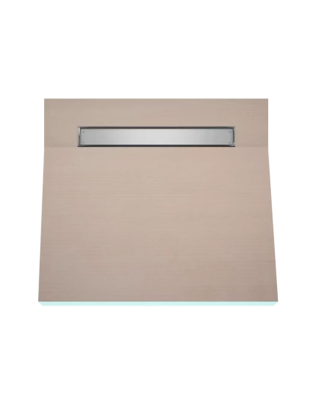 Dieses befliesbare Duschsystem besitzt ein vorgeformtes 4-seitiges Gefälle, welches aus allen vier Ecken zum Abfluss verläuft. Es wird werkseitig per CNC-Technik in die Platte eingefräst und garantiert eine perfekte Neigung (je nach Plattengröße und -stärke) für eine gleichmäßige Entwässerung. Diese präzise Verarbeitung erleichtert das korrekte Schneiden und Verlegen der Fliesen. Im Herstellungsprozess wird die Außenkante der Duschplatte angehoben, während der Bereich um den Ablauf leicht abgesenkt wird. Ziel war es, trotz unterschiedlicher Plattenstärken, weiterhin eine möglichst flache und ebenerdige Konstruktion zu ermöglichen.
