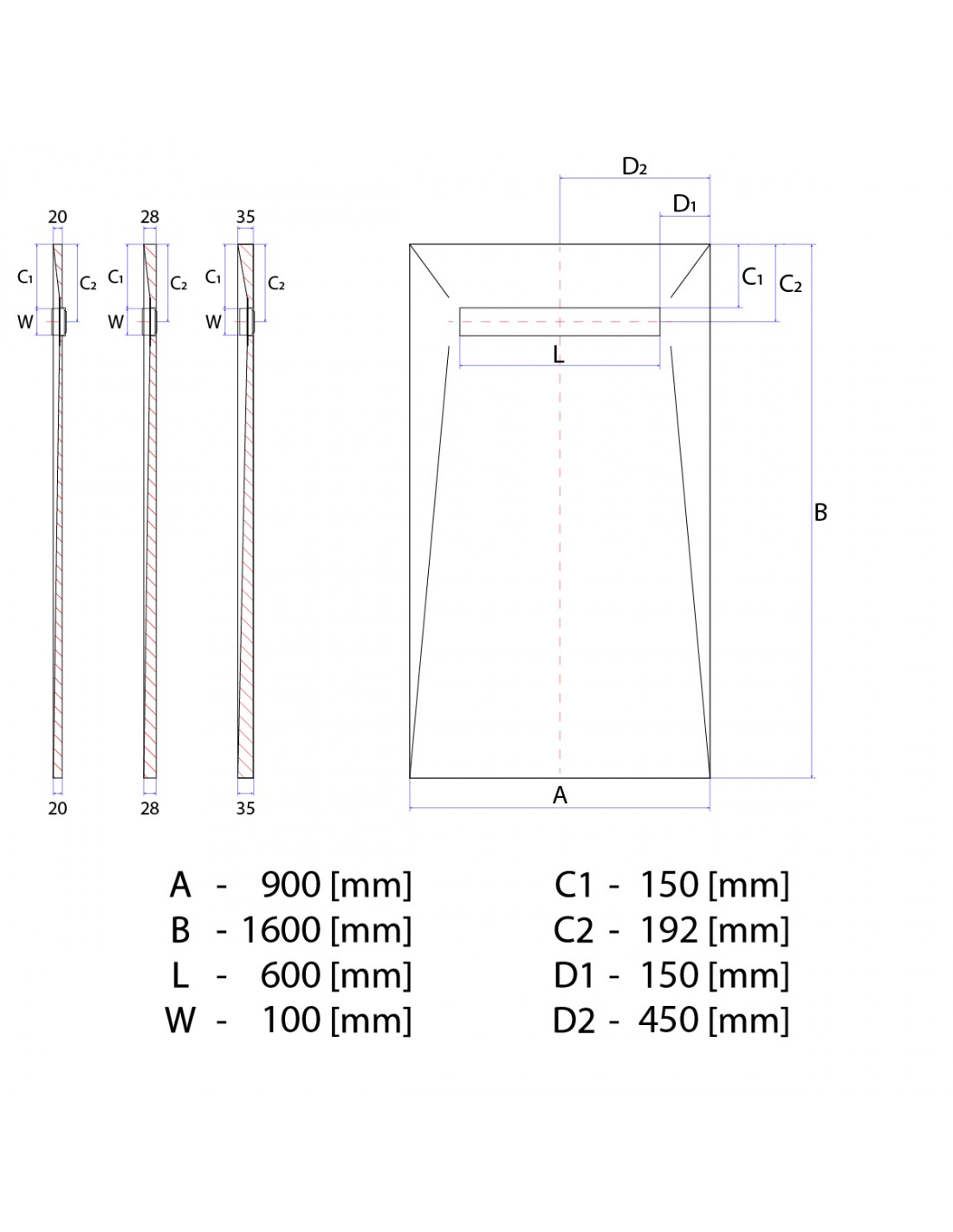 - Eine Plattenstärke von 35 mm ist die dickste verfügbare Stärke mit einem steileren Gefälle, höherer Schalldämmung und robusteren Oberfläche. Es eignet sich für größere Duschbereiche mit einer Längenseite ≥ 120 cm.