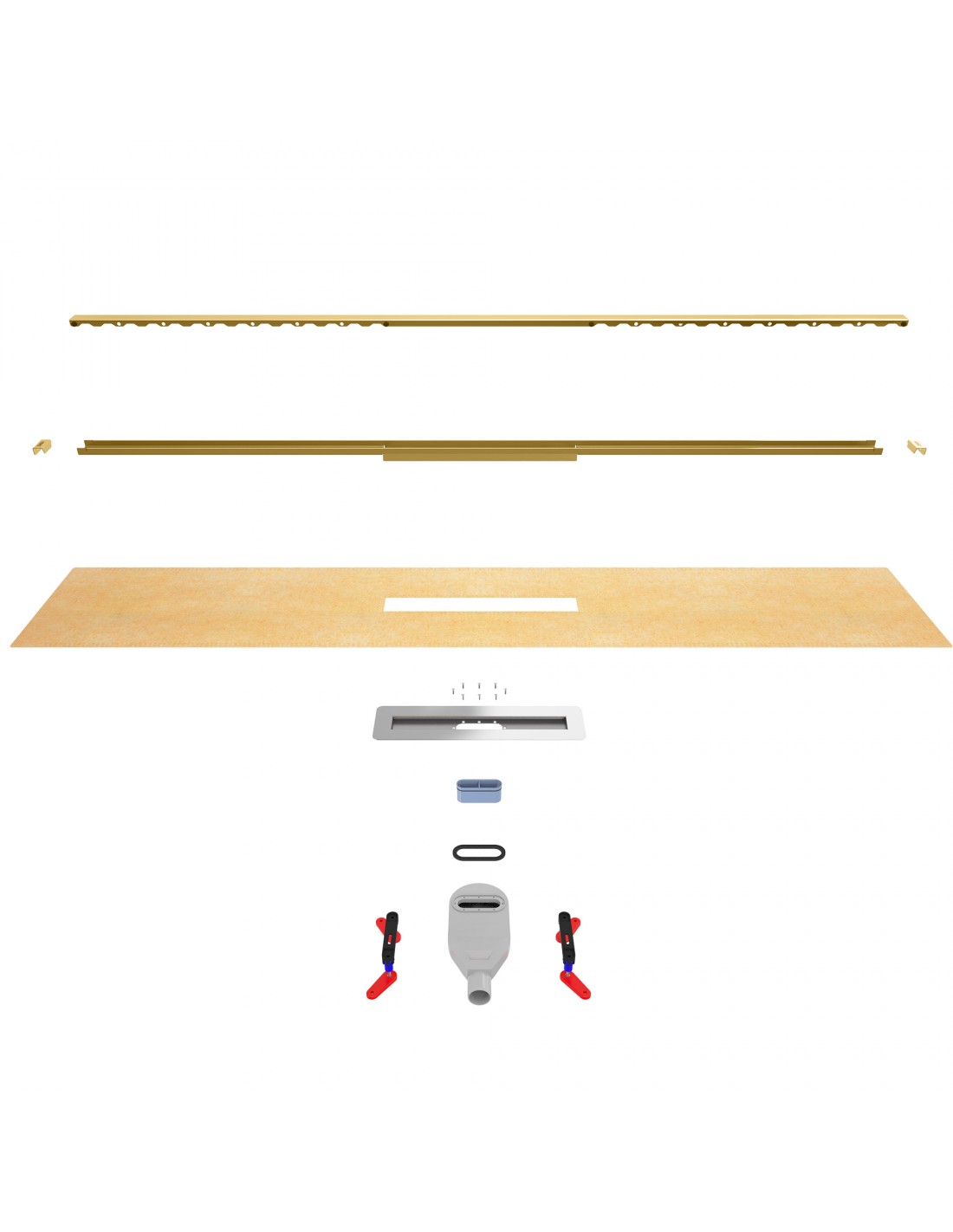Edelstahl Duschrinne 100 cm in Messing für Mikrozement 3-12 mm (einstellbar) mit Isolierflansch | Komplett-Set inkl. Designrost Pure (befliesbar), Dichtmanschette, höhenverstellbare Standfüße und Siphon