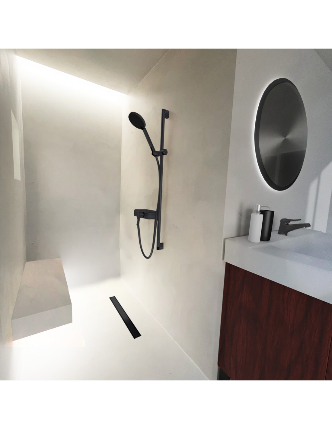 Die Duschrinne 60 cm Wiper MCR PVD Sirocco Black ist unsere neueste Innovation für Mikrozement – ein dünnschichtiger dekorativer Belag, welcher aus Zement, Harzen, Additiven und Pigmenten hergestellt wird. Dieser Bodenbelag erzeugt einen ästhetischen, industriellen Look und wird bei der Anwendung im Badezimmer immer beliebter. Das Komplett-Set umfasst den Rinnenkörper mit einstellbarer Belaghöhe zwischen 3-12 mm, Dichtmanschette, Montagefüße, Siphon sowie ein Designrost in der Oberfläche und Farbe nach Wahl. Eine 60 cm lange Duschrinne ist eine beliebte Wahl für Duschen mit einer Breite von 80 cm.