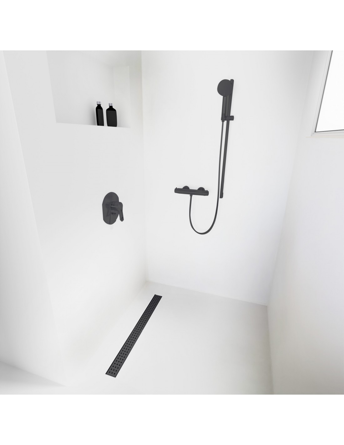 Die Duschrinne 80 cm Wiper MCR PVD Mistral Black ist unsere neueste Innovation für Mikrozement – ein dünnschichtiger dekorativer Belag, welcher aus Zement, Harzen, Additiven und Pigmenten hergestellt wird. Dieser Bodenbelag erzeugt einen ästhetischen, industriellen Look und wird bei der Anwendung im Badezimmer immer beliebter. Das Komplett-Set umfasst den Rinnenkörper mit einstellbarer Belaghöhe zwischen 3-12 mm, Dichtmanschette, Montagefüße, Siphon sowie ein Designrost in der Oberfläche und Farbe nach Wahl. Eine Duschrinne in 80 cm ist die beliebteste Wahl für eine 1 Meter breite Dusche.
