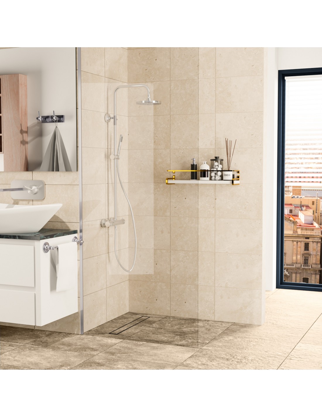 Der Einbau der Ablaufrinne kann sowohl in Estrich/Beton als auch auf Holzböden erfolgen (Hinweis: bei Holzböden ist eine Unterkonstruktion von mind. 20 mm notwendig, um ausreichend Tragfähigkeit zu gewährleisten). Dieses Modell ist in zahlreichen Längen erhältlich – passend für unterschiedliche Raumanforderungen. Basierend auf der Gesamtbreite des Duschraums, empfehlen wir eine 20 cm kürzere Länge zu wählen, um ein optimales Gefälle zum Abfluss zu erstellen. Das Komplett-Set beinhaltet den Duschrinnenkörper mit höhenverstellbarem Rahmen und sekundärer Ablaufebene, Designrost in der Farbe und Oberfläche nach Wahl, Montagefüße, Dichtmanschette sowie wahlweise ein waagerechtes oder senkrechtes Siphon. Eine noch einfachere Montage bietet ein einbaufertiges Duschelement mit bereits integrierter Duschrinne Elite PVD.