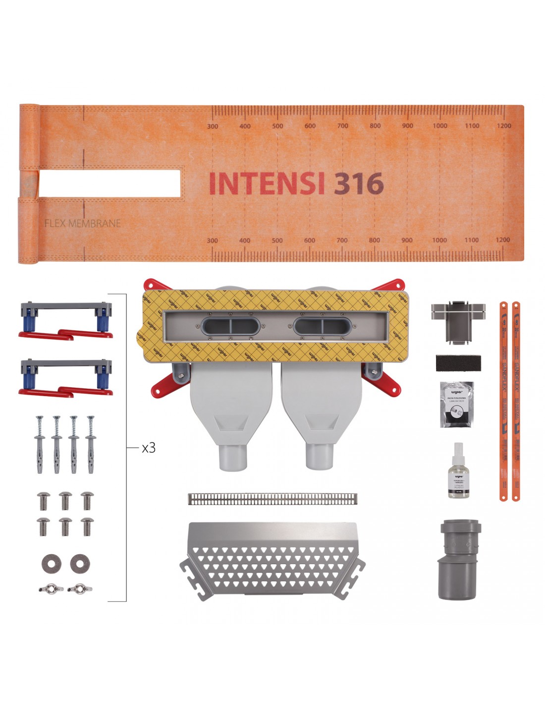 Dies wird dadurch erreicht, dass der integrierte Ablauf aus drei Teilen besteht. Der Ablaufkörper, der werkseitig in das Element eingebaut ist, bildet die Rinne für die primäre und sekundäre Entwässerung. Der verstellbare Rahmen, der auf die exakte Höhe des fertigen Fußbodens angehoben werden kann und gleichzeitig die Möglichkeit bietet, dass der Sekundärabfluss seinen Weg in die Rinne findet. Schließlich der Designrost, der sich auf dem Rahmen abstützt und für einen eleganten Abschluss sorgt. Gleichzeitig ermöglicht schnellen Zugang für eine einfache Reinigung.