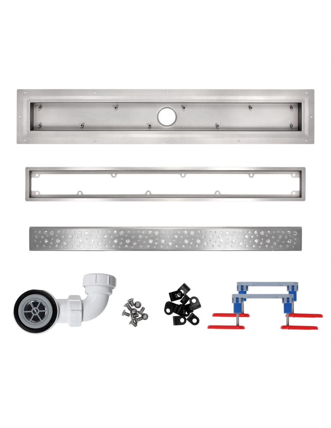 Das Komplett-Set umfasst den Rinnenkörper mit höhenverstellbarem Rahmen und sekundärer Ablaufebene, Dichtmanschette, Montagefüße, Siphon sowie ein Designrost in der Farbe und Oberfläche nach Wahl. Eine 60 cm lange Duschrinne ist eine beliebte Wahl für Duschen mit einer Breite von 80 cm.