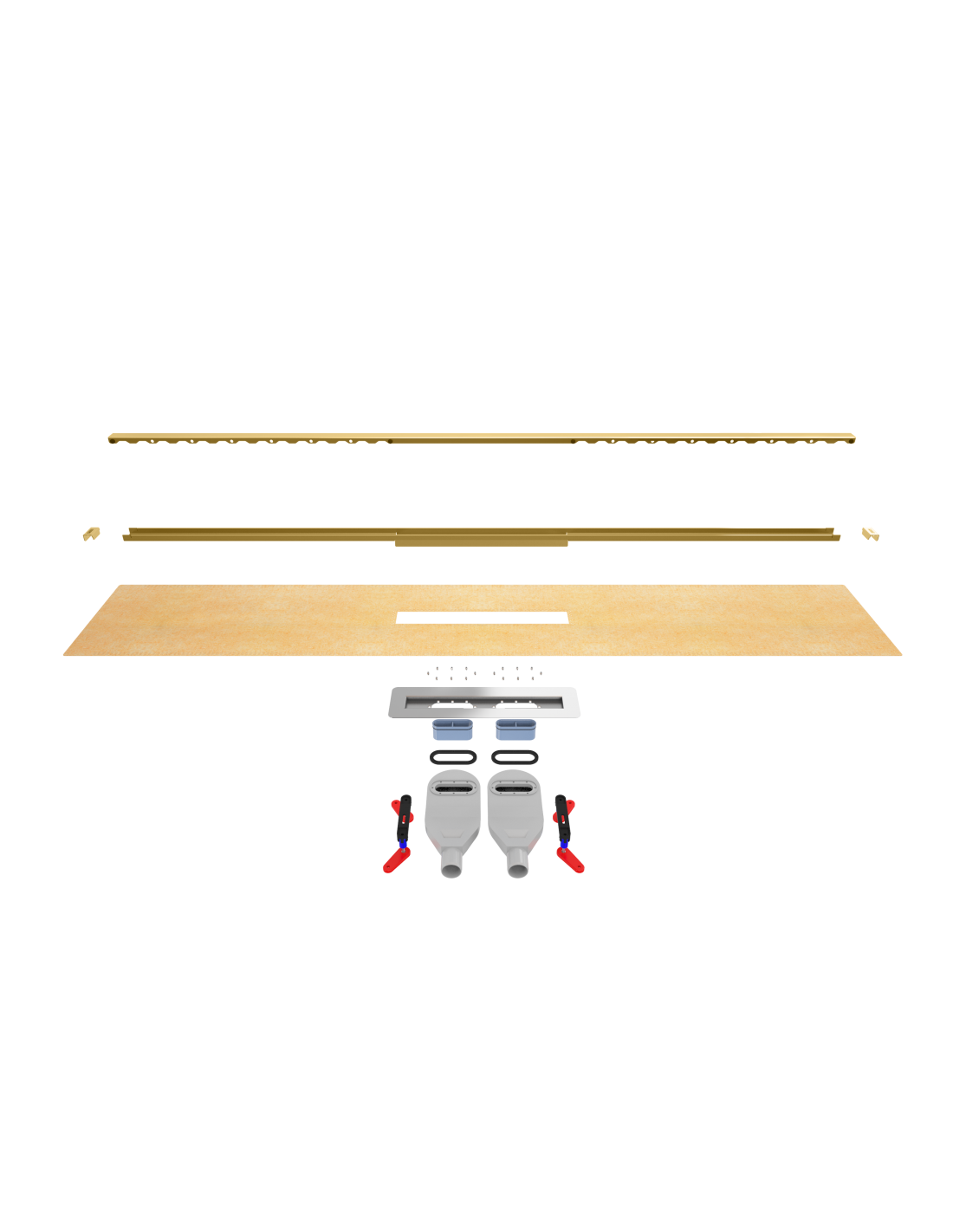 Dies wird dadurch erreicht, dass der integrierte Ablauf aus drei Teilen besteht. Der Ablaufkörper, der werkseitig in das Element eingebaut ist, bildet die Rinne für die primäre und sekundäre Entwässerung. Der verstellbare Rahmen, der auf die exakte Höhe des fertigen Fußbodens angehoben werden kann und gleichzeitig die Möglichkeit bietet, dass der Sekundärabfluss seinen Weg in die Rinne findet. Schließlich der Designrost, der sich auf dem Rahmen abstützt und für einen eleganten Abschluss sorgt. Gleichzeitig ermöglicht schnellen Zugang für eine einfache Reinigung.