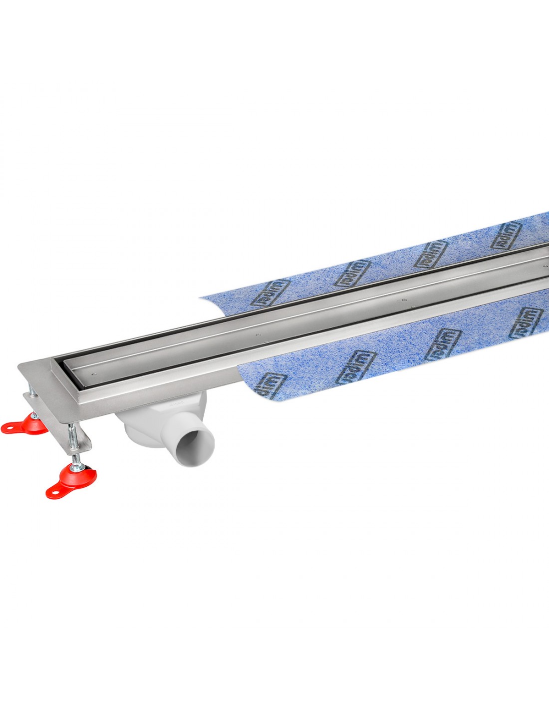 Das Komplett-Set umfasst den Rinnenkörper mit höhenverstellbarem Rahmen und sekundärer Ablaufebene, Dichtmanschette, Montagefüße, Siphon sowie ein Designrost in der Farbe und Oberfläche nach Wahl. Eine Duschrinnen-Länge von 90 cm eignet optimal sich für geräumige Duschen, welche breiter als 1 Meter sind.