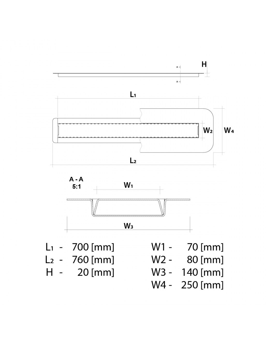 - Material und Struktur: Die gesamte Ablaufrinne inklusive Siphon ist aus Edelstahl AISI 304, gem. DIN EN 10088, gefertigt (316 auf Anfrage möglich).