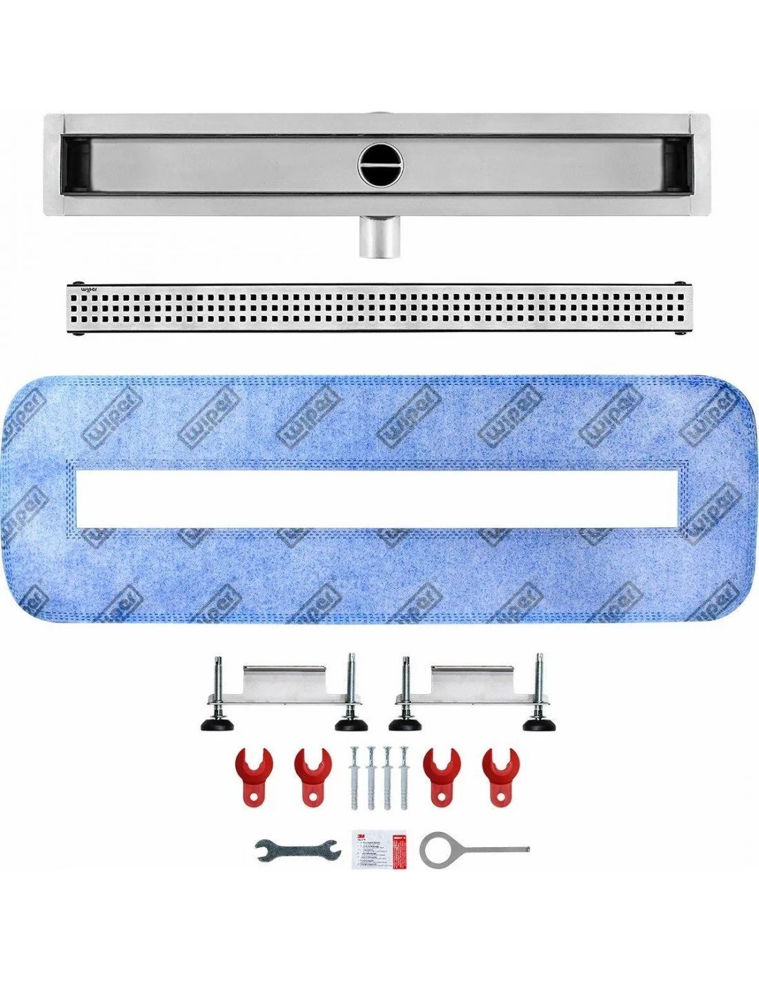 Die Duschrinne 60 cm Wiper Premium Slim Sirocco ist eine filigrane, flache Ablauflösung für Fliesenboden. Sie besitzt eine besonders niedrige Einbauhöhe von nur 58 mm; mit Fliesen liegt die Gesamteinbauhöhe bei 70 mm. Das Komplett-Set umfasst Rinnenkörper mit angeschweißtem Siphon (nicht drehbar), Dichtmanschette, Montagefüße und Designrost nach Wahl. Eine 60 cm lange Duschrinne ist eine beliebte Wahl für Duschen mit einer Breite von 80 cm.