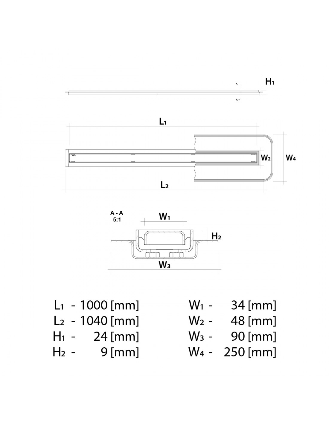 - Material und Struktur: Die gesamte Ablaufrinne inkl. Designrost und Siphon ist aus Edelstahl AISI 304, gem. DIN EN 10088, gefertigt (316 auf Anfrage möglich).